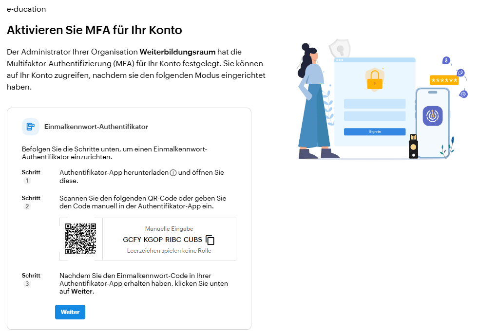 - Klicke auf „Weiter“. Das System fordert dich auf, den in deiner Authentifizierungs-App generierten Code einzugeben.
